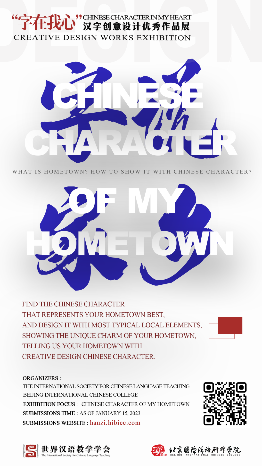 为打破“汉字难”的刻板印象,激发国际青少年了解汉字文化、学习中文、了解中国的兴趣;探索与实践全球化语境下汉字的创新性传播途径,世界汉语教学学会与北京国际汉语研修学院推出“‘字在我心’汉字创意设计作品展”。2022年作品展主题为“字说家乡”,邀请全球国际青少年通过对汉字的文化赋能和创意性设计,来讲述、传播自己的家乡。In order to change the impression that Chinese characters are difficult to learn and arouse the interest of global youth to learn about China and its culture, the International Society for Chinese Language Teaching and Beijing International Chinese College jointly launched the “Chinese Character in My Heart” Creative Design Works Exhibition, aiming to explore and practice innovative ways of spreading the culture of Chinese characters in the context of globalization. The theme of the 2022 works exhibition is “Character of My Hometown”. Young people around the world are invited to tell stories about their hometown using Chinese characters or the innovative design of Chinese characters.