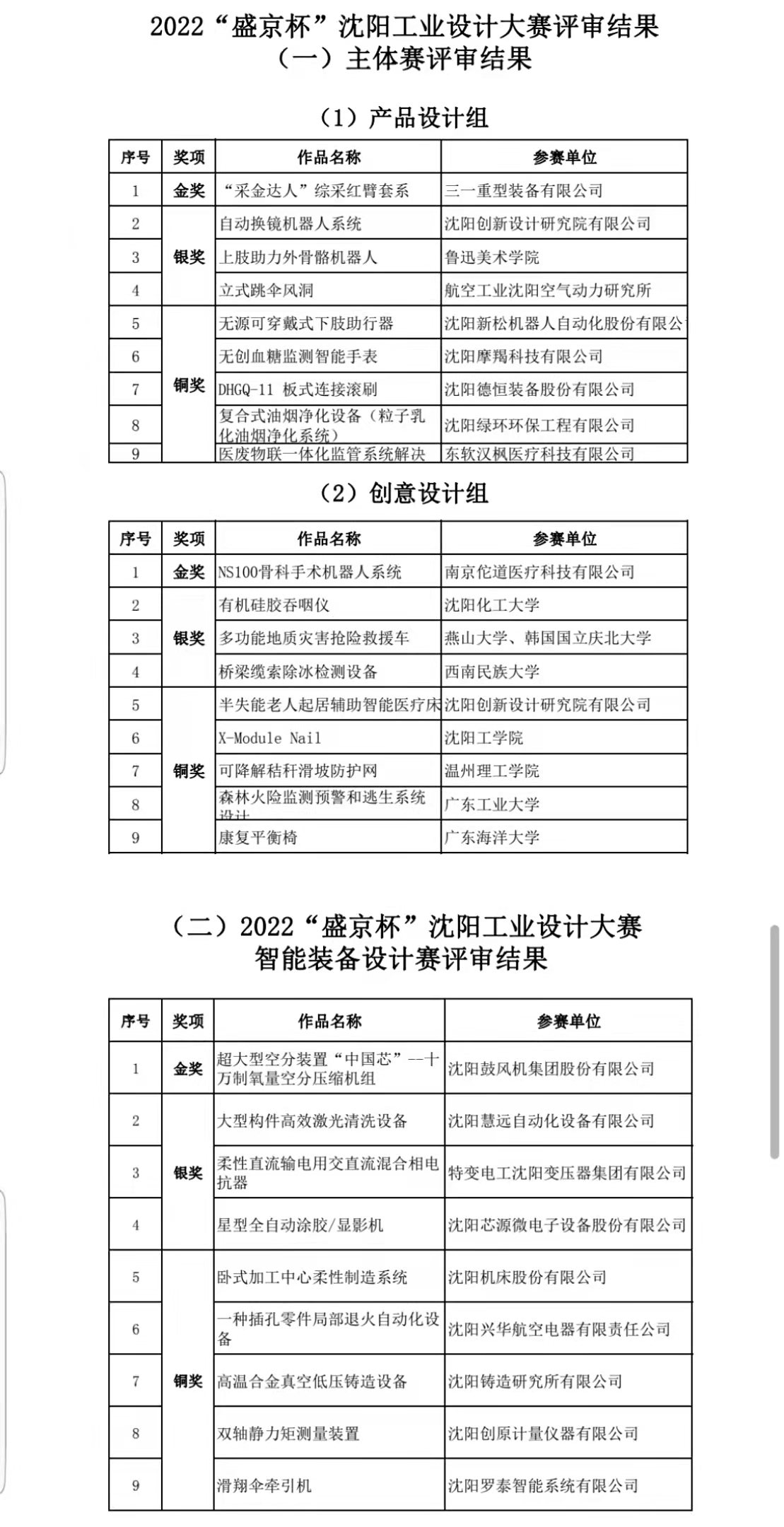 在主体赛评审结果中,“采金达人”综采红臂套系获产品设计组金奖,NS100骨科手术机器人系统获创意设计组金奖;在装备产品设计赛评审结果中,超大型空分装置“中国芯”十万制氧量空分压缩机组获金奖;在文化创意设计赛评审结果中,辽瓷——四季捺钵酒瓶获产品设计组金奖,SWELL香薰&加湿器获创意设计组金奖;在职工发明设计赛评审中,高尺寸精度刨刀工具设计获五小活动组金奖,模具电气动态检测箱获创新工作室组金奖,一种大幅提升划片机切割品质的气缸喷水罩获科技型企业组金奖。