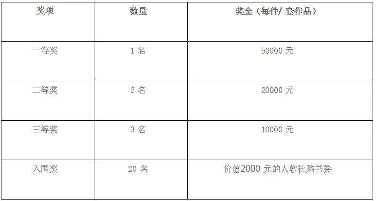 注:1.以上获奖作品将计划应用于人教社文创开发,具体权责请参考本活动方案第八条;2.同一应征者的作品获得奖励最多不超过2项;3.奖金均为税前金额。
