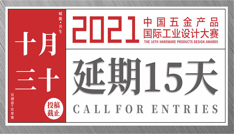 应广大参赛者和部分院校指导老师的延迟截稿要求,经2021年第16届中国五金产品国际工业设计大赛组委会商议决定:将大赛作品征集截稿时间由原定的10月15日延期至2021年10月30日晚24:00。欢迎有意参赛的设计师、师生们抓紧时间创作、踊跃投稿!