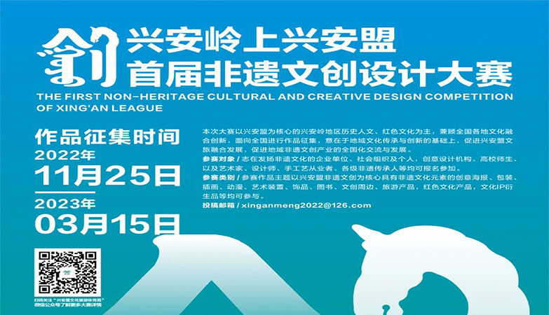 参赛类别:参赛作品主题以兴安盟非遗文创为核心具有非遗文化元素的创意海报、包装、插画、动漫、艺术装置、饰品、图书、文创周边、旅游产品,红色文化产品,文化IP衍生品等均可参与。兴安盟非遗代表性项目、传承人请关注“兴安盟文化馆”官方公众号或“兴安盟文化旅游体育局”公众号查询。