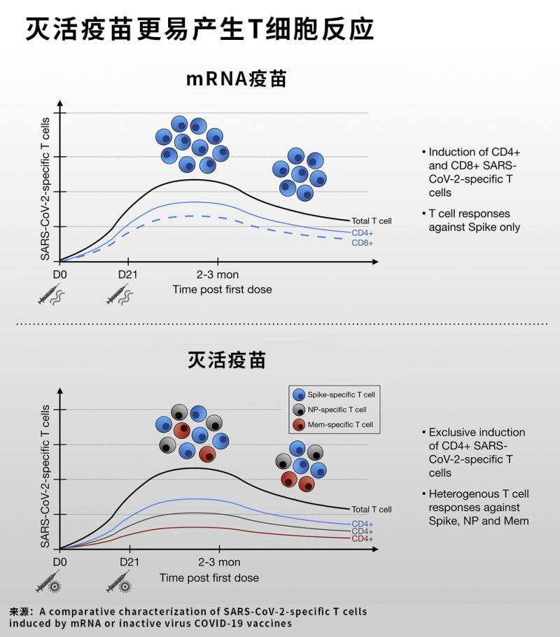 研究发现,相较于其他类型的疫苗,灭活疫苗更易产生针对病毒蛋白的T细胞反应。灭活疫苗会刺激名为CD4 T的细胞,当它识别病毒抗原时,会释放成为细胞因子的化学物质,以帮助激活其他类型的免疫细胞。